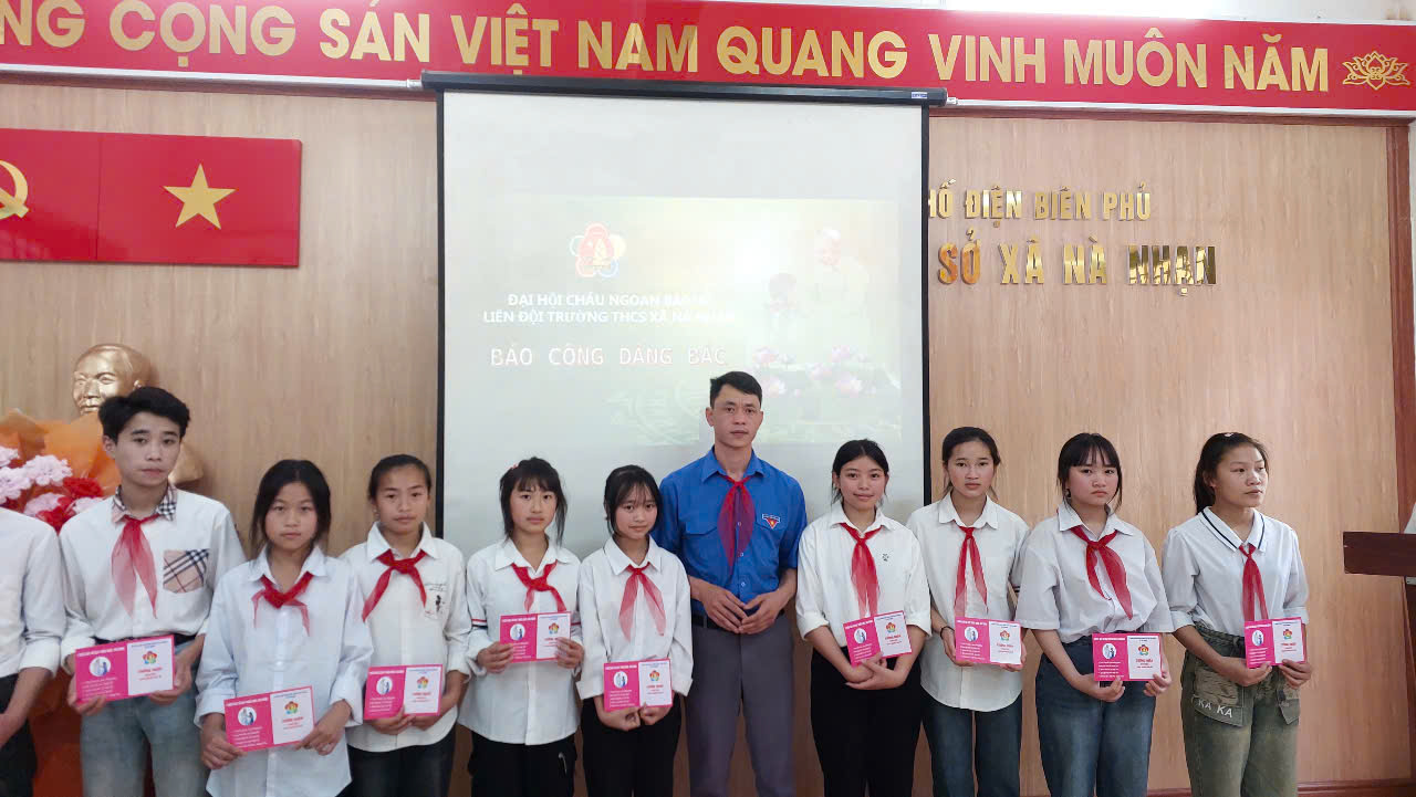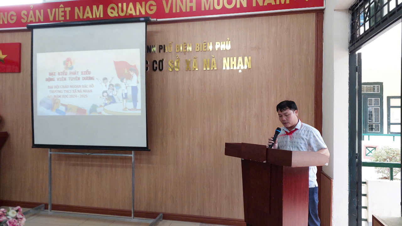 Thầy: Nguyễn Trọng Thuận – Phó bí thư Chi bộ, phó Hiệu trưởng nhà trường. Đ/C: Quàng Văn Hà – Bí thư Đoàn xã Nà Nhạn. Đ/c: Lò Thị Biên – Bí thư Đoàn trường THCS xã Nà Nhạn. Cùng toàn thể các anh chị phụ trách và 240 bạn đội viên ưu tú của nhà trường. Thay mặt Liên đội, em Lường Thị Yến Diệu đã báo cáo kết quả và những thành tích đạt được trong hoạt động của Liên đội trong năm học vừa qua. Các hoạt động của Liên đội đã bám sát kế hoạch của chi bộ, Ban giám hiệu nhà trường, Hội đồng đội TP Điện Biên phủ và Hội đồng đội xã Nà Nhạn nhằm triển khai các hoạt động của Liên đội một cách hiệu quả nhất. Đến dự với Đại hội, thầy Nguyễn Trọng Thuận – Phó bí thư Chi bộ, phó Hiệu trưởng nhà trường đã biểu dương và chúc mừng những thành tựu mà Liên đội đội đã đạt được trong năm học 2023 – 2024 và học kỳ I năm học 2024 – 2025, thay mặt Chi ủy, BGH nhà trường thầy đã trao phần quà vô cùng ý nghĩa cho các em đội viên trong buổi Đại hội. Đại hội đã khép lại với những danh hiệu khen thưởng hết sức ý nghĩa, tặng giấy chứng nhận Cháu ngoan Bác Hồ cho 240 bạn học sinh có thành tích xuất sắc trong học tập và các hoạt động của Liên đội trong phong trào thiêu nhi học tập và làm theo tấm gương đạo đức Hồ Chí Minh. Một số hình ảnh trong buổi Dại Hội Cháu ngoan Bác Hồ.