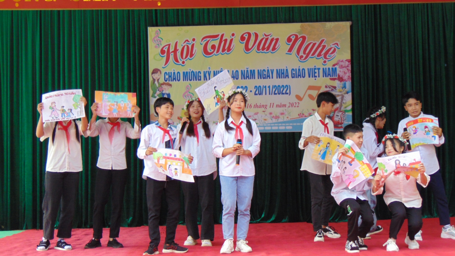 Hội thi thứ nhất: Hội thi Văn nghệ chào mừng kỷ niệm 40 năm Ngày Nhà giáo Việt Nam (20/11/1982- 20/11/2022). Hội thi năm nay có sự tham gia của 12 lớp, các lớp đã đem đến Hội thi 28 tiết mục ca, múa nhạc xoay quanh chủ đề ca ngợi Đảng, Bác Hồ, tình yêu quê hương, đất nước, ca ngợi nghề dạy học và sự nghiệp giáo dục đào tạo, ngợi ca tình đoàn kết gắn bó giữa các dân tộc. Tham gia hội thi có nhiều tiết mục với nhiều thể loại khác nhau: đơn ca, song ca, tốp ca, múa, kịch… đến từ các chi đoàn học sinh. Các tiết mục đều có sự chuẩn bị tập luyện kỹ lưỡng, dàn dựng công phu, nhất là chú ý chủ đề và ý nghĩa tiết mục, phong cách biểu diễn.