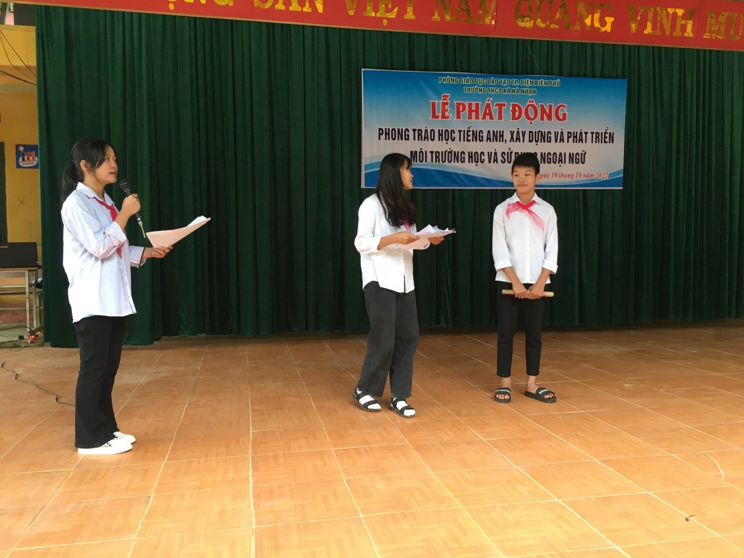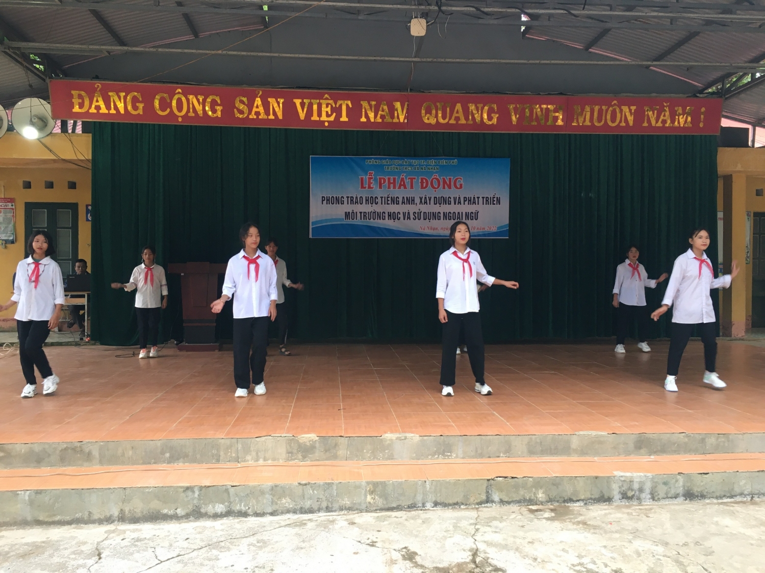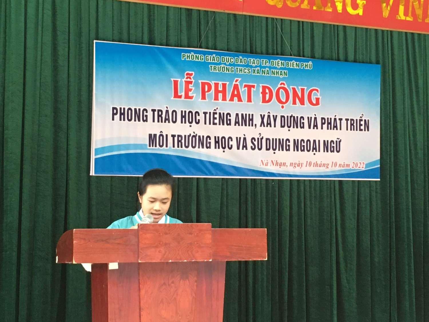 Căn cứ Công văn số 4536/BGDĐT- GDCTHSSV ngày 04/10/2019 của Bộ Giáo dục và Đào tạo; công văn số 2220/KH-SGDĐT ngày 18/10/2019 của Sở Giáo dục và Đào tạo về hướng dẫn triển khai thực hiện phong trào học tiếng Anh, xây dựng và phát triển môi trường học và sử dụng ngoại ngữ; Căn cứ Công văn số 1111/PGDĐT-THCS, ngày 23/08/2022 về việc hướng dẫn thực hiện nhiệm vụ trọng tâm đối với cấp THCS năm học 2022-2023. Sáng ngày 10 tháng 10 năm 2022, Trường THCS xã Nà Nhạn đã tổ chức lễ phát động về xây dựng và phát triển môi trường học và sử dụng Tiếng Anh trong nhà trường. Về dự buổi lễ có các thầy trong Ban giám hiệu cùng toàn thể các thầy cô giáo và các em học sinh trong toàn trường.