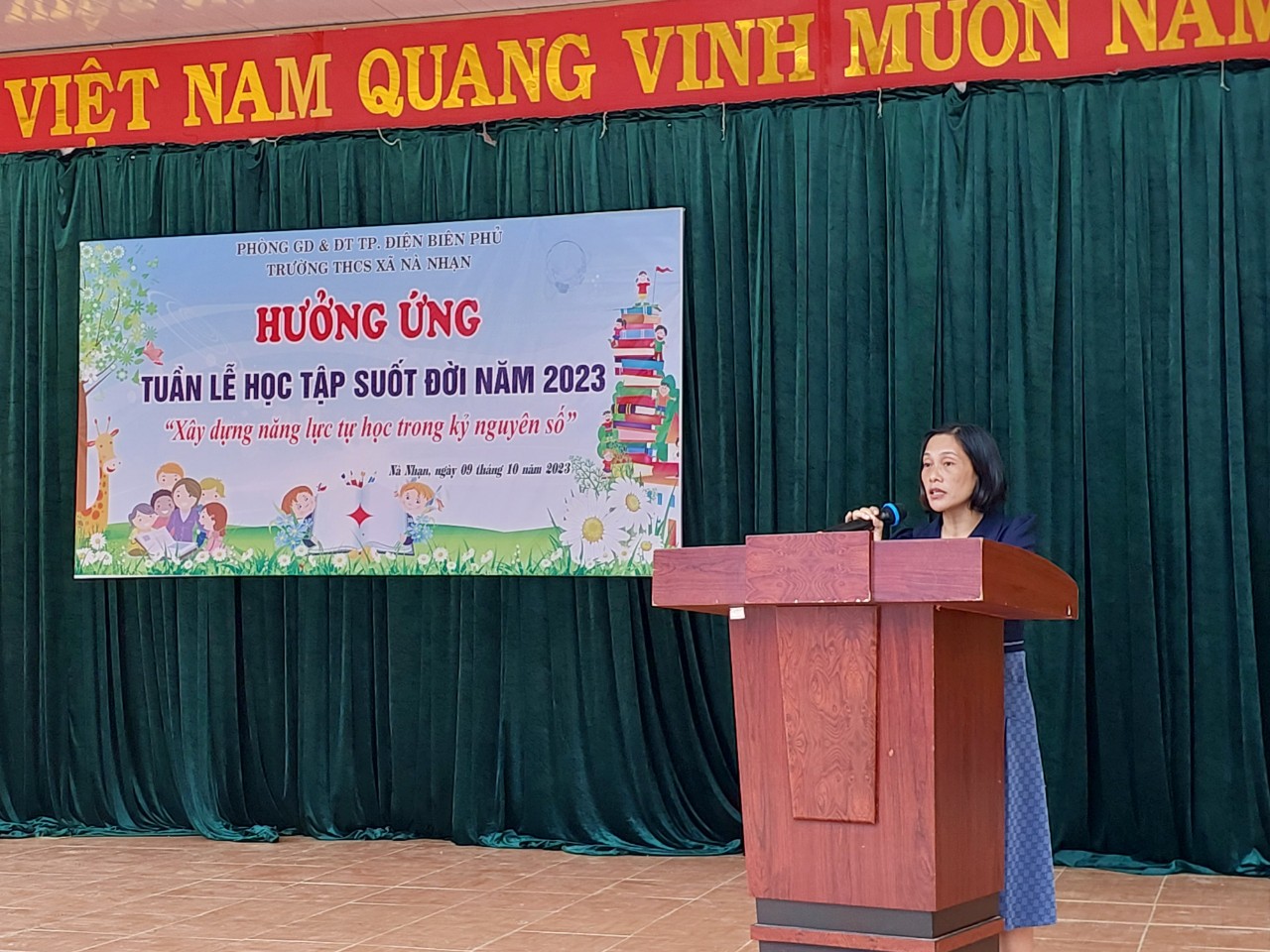 Căn cứ theo văn bản số 1475/PGDĐT, ngày 26/9/2023 của PGDĐT Thành Phố Điện Biên Phủ V/v triển khai thực hiện Kế hoạch tổ chức Tuần lễ hưởng ứng học tập suốt đời năm 2023, ngày 9 tháng 10 năm 2023 trường THCS xã Nà Nhạn tổ chức Lễ khai mạc Tuần lễ hưởng ứng học tập suốt đời năm 2023 với chủ đề